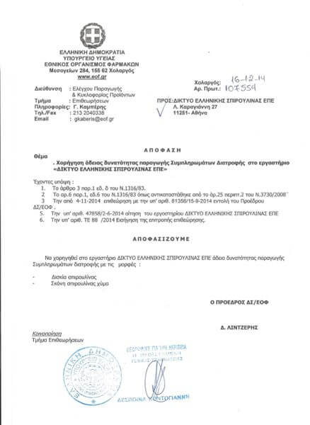 Additionally, the Hellenic Spiroulina Net has production licence for supplements from the National Organisation for Medicine (No. License 107554/16.12.2014)