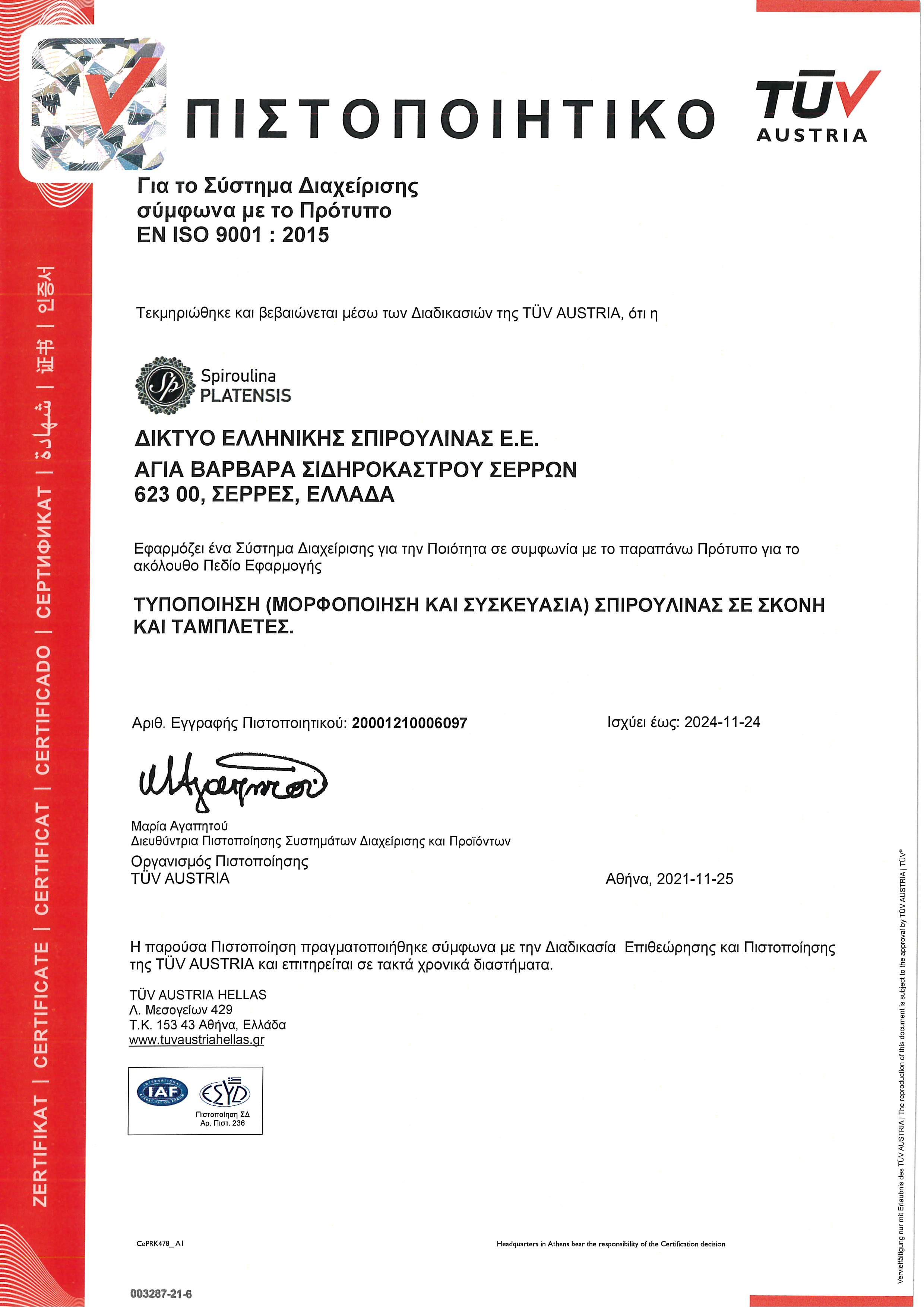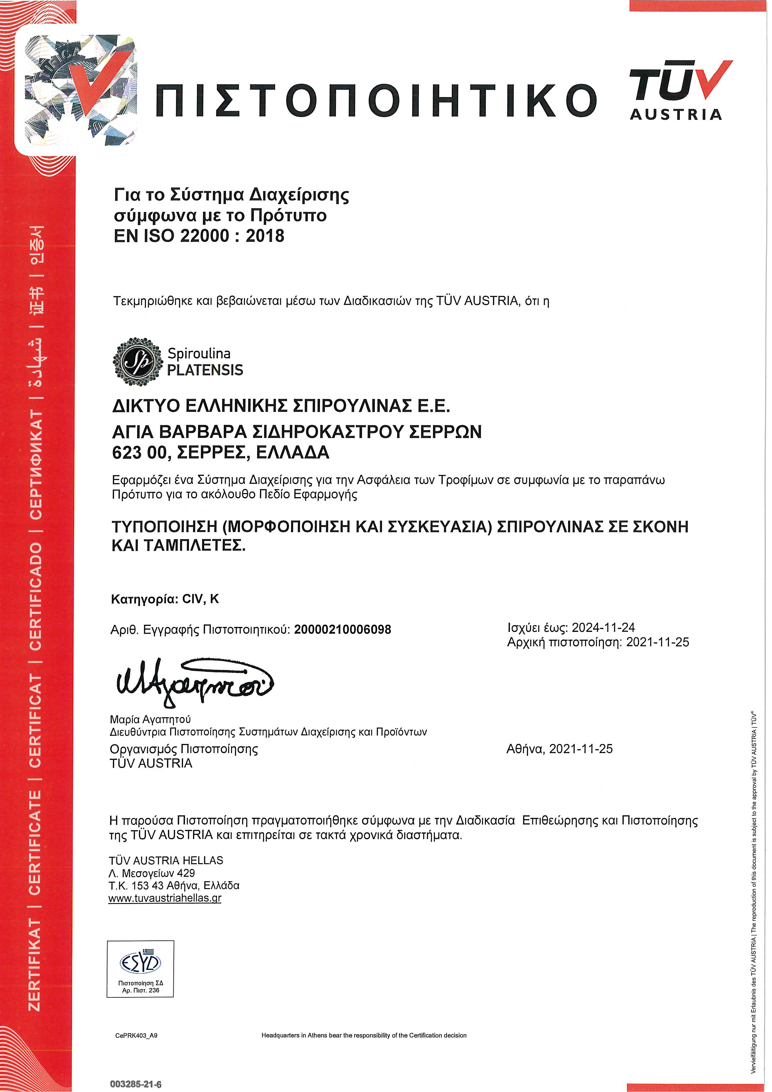 From the very first moment, special emphasis was given to the care of quality issues both the raw materials and production processes as well as the used water. The rewarding of our efforts with the international Certifications of Food Security Monitoring System received from TUV Austria Hellas, is the guarantee quality of the Spiroulina PLATENSIS products.