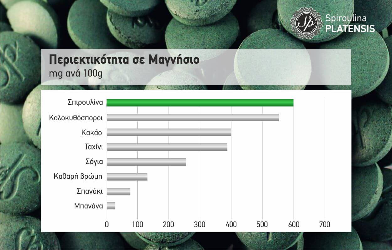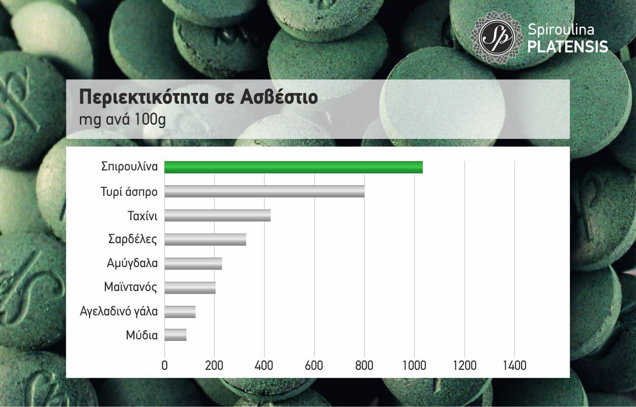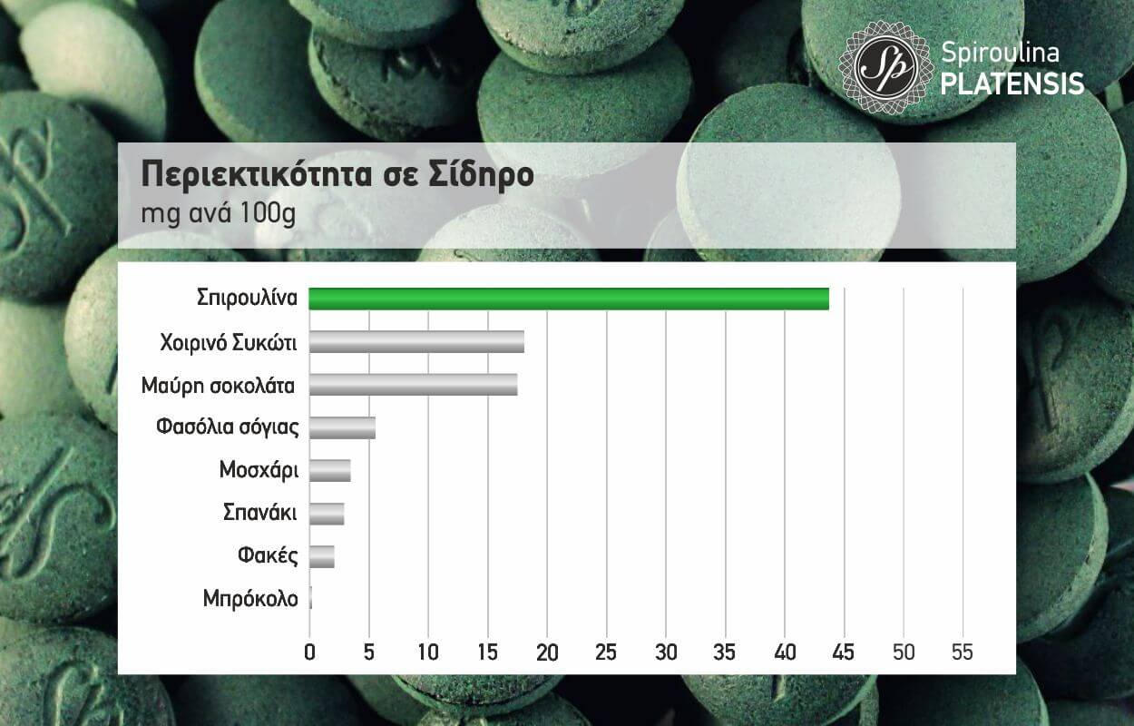 Στα παρακάτω διαγράμματα μπορείτε να δείτε την περιεκτικότητα της σπιρουλίνας σε σίδηρο, ασβέστιο & μαγνήσιο συγκριτικά με άλλα τρόφιμα