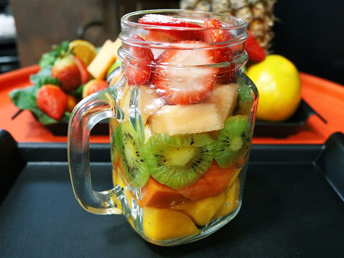 - Πλένετε, καθαρίζετε και κόβετε τα φρούτα σε κυβάκια.